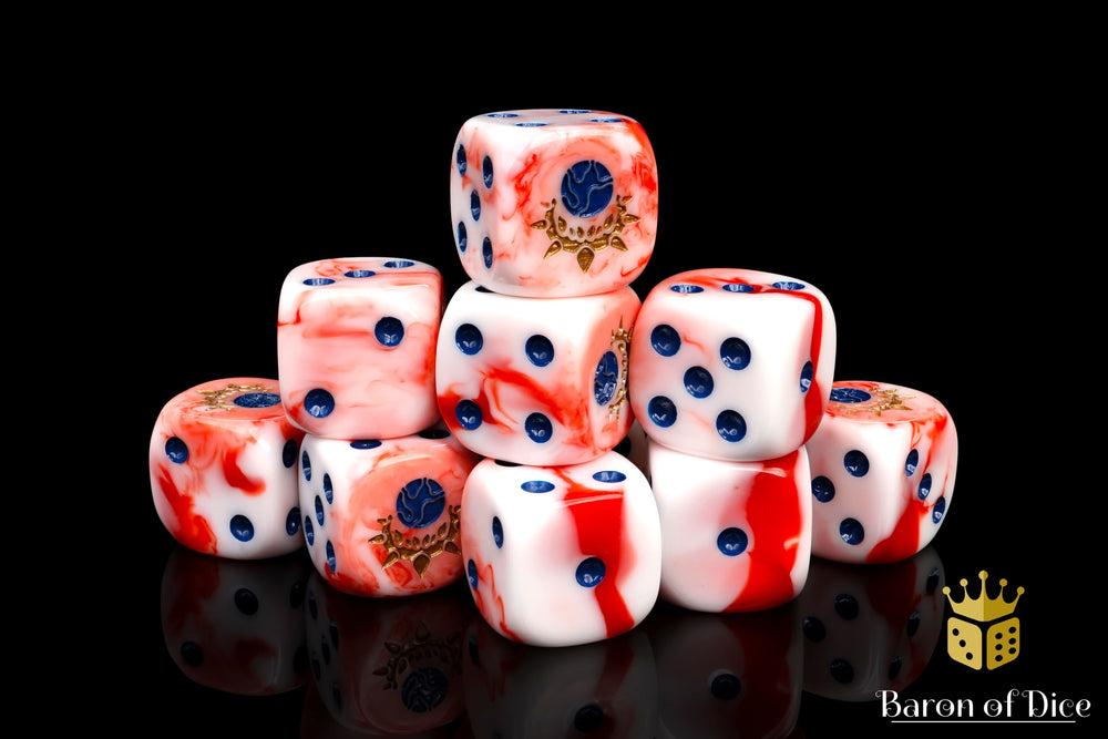 These contain a base of [once] noble whites swirled with dark, dried, bloody hues and inlaid with a two-toned dark blue and rusted brass; resin 16mm dice.  The symbols are on the 6 side. These dice have an option of round or square corner, choose wisely!  Our premium dice now come in a unique reusable tin. Consider the 8 count for Blessing of Blood rolls!