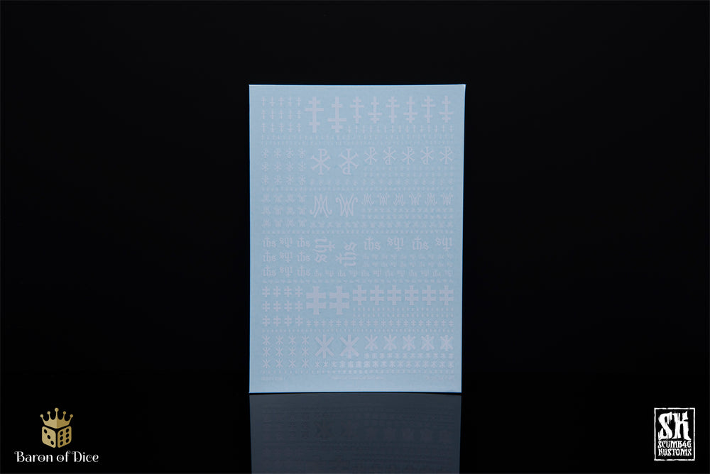The Crusade Icons A waterslide decal sheet contains six distinct icons in multiple sizes making it suitable for a wide range of applications. The icon set is intentionally versatile so it can be used in various settings ranging from historical to post-apocalyptic. The variety of sizes makes it easy to apply the decals to infantry, vehicles, banners, shields, and terrain pieces.