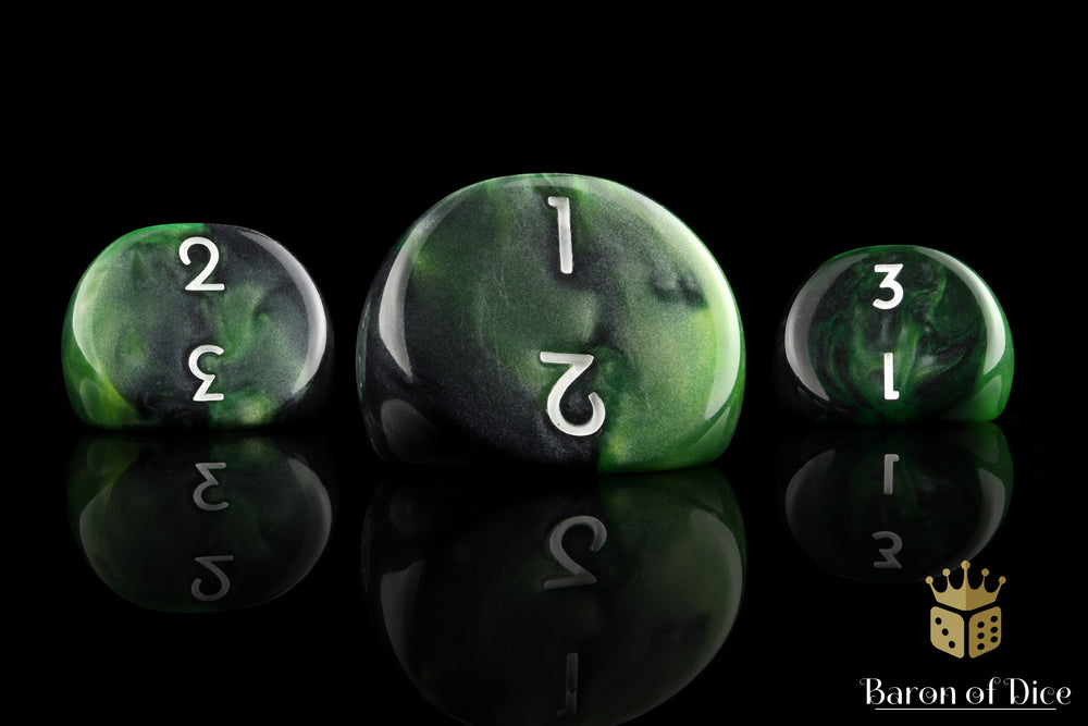Sold by the single or a pack of 5 or 10. These contain a combination of wicked resin colors swirled together and hand inlaid; 16mm D3 dice. Numbers 1-3 on three sides. Clean, Clear, Concise!